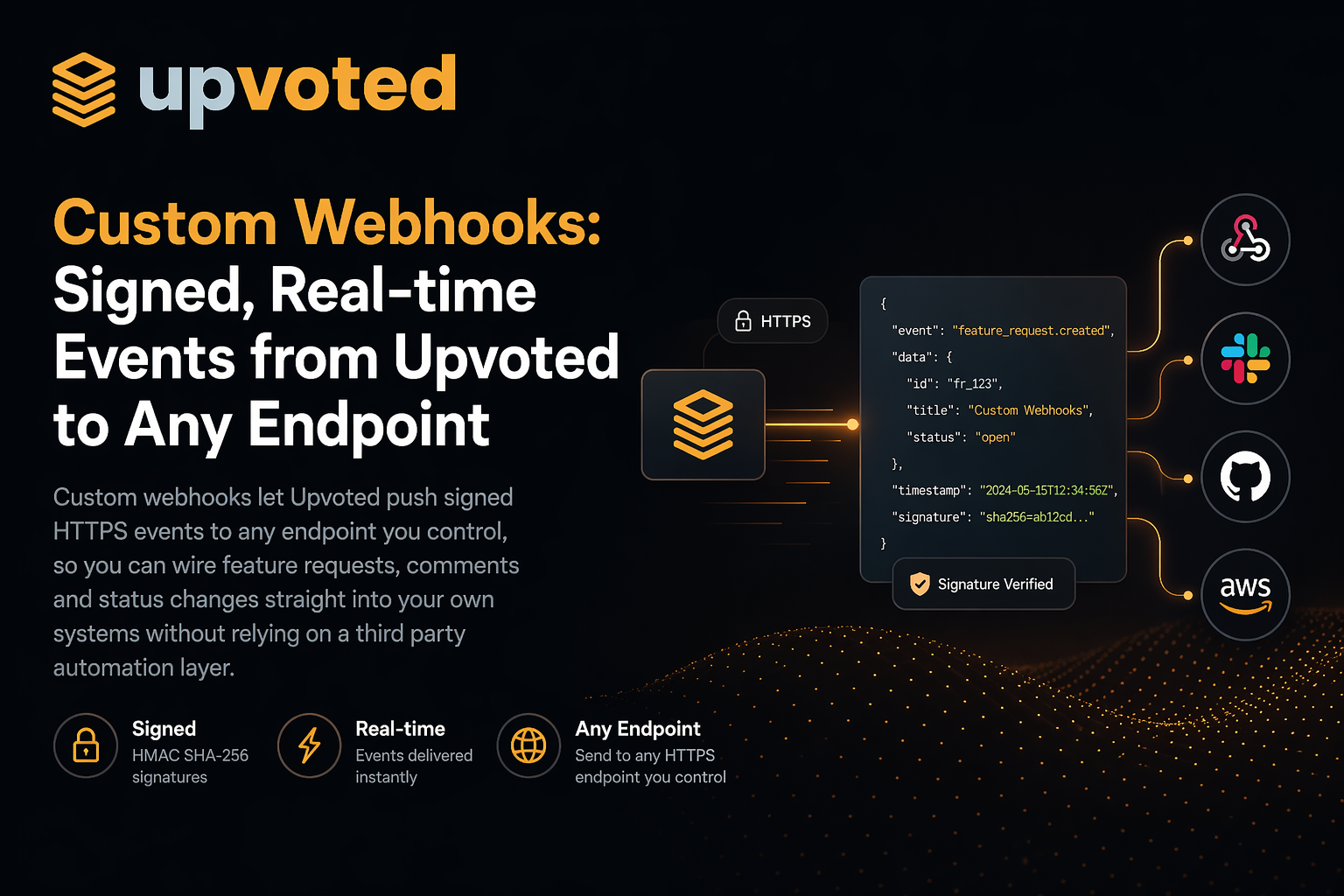 Custom webhooks let Upvoted push signed HTTPS events to any endpoint you control, so you can wire feature requests, comments and status changes straight into your own systems without relying on a third party automation layer